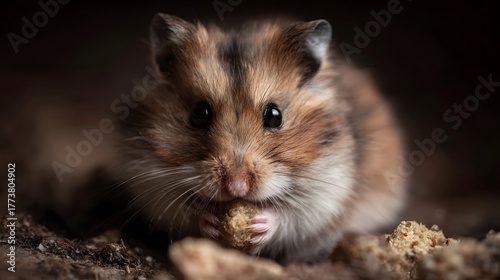 A close up of a cute hamster eating a small piece of food with its paws
