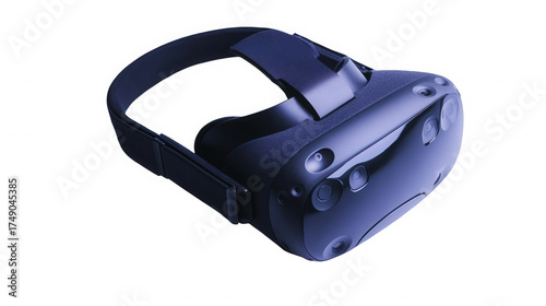 A close up of a dark blue virtual reality headset on a black background on transparent background