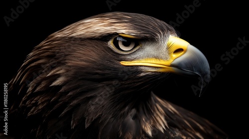 A close up of a eagle's head with a yellow beak and a black background