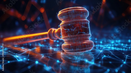 A close up of a glowing digital gavel against a blue and orange grid network.
