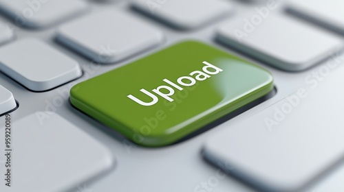 A close up of a green button on the keyboard that says upload, AI