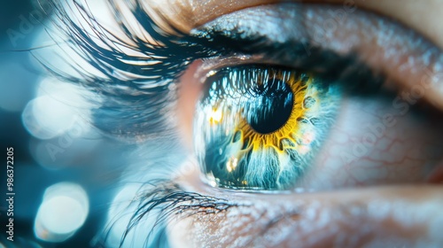 A close up of a human eye, with intricate details of the iris and pupil, reflecting a vibrant, abstract landscape.