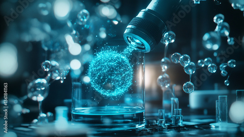 A close up of a microscope examining a glowing blue sphere in a glass beaker with water inside it