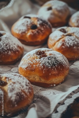 A close up of a plate of powdered donuts. The donuts are all different sizes and shapes, but they all have powdered sugar on top. Concept of indulgence and comfort