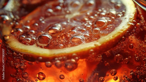 A close up of a slice of lemon in some liquid, AI