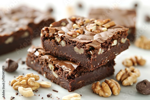 A close up of a stack of chocolate bars with nuts on the side of it and a few pieces of chocolate on