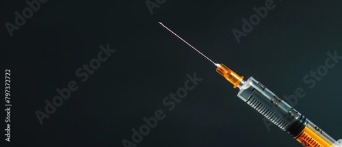A close up of a syringe and a vial with a blue liquid. The background is out of focus and there are some lights in the background.