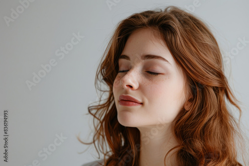A close up of a woman's face with her eyes closed looking to a side