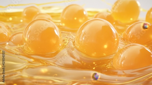 A close up of a yellow liquid with many small spheres floating in it. The liquid appears to be a mixture of oil and water, with the spheres representing bubbles. Concept of movement and fluidity