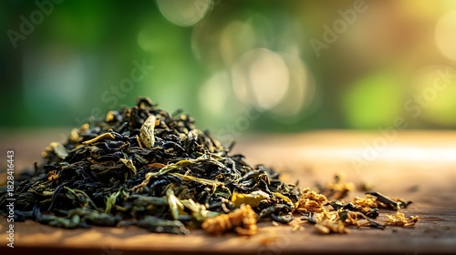A close up of dried black tea leaves on a wooden surface