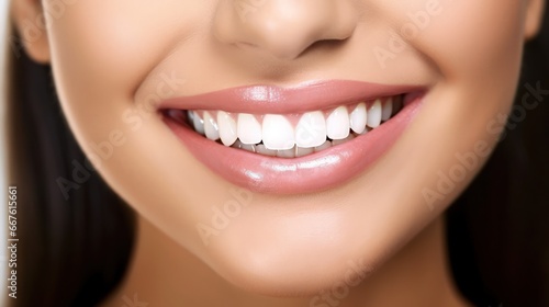 A close up of perfect, healthy, white teeth in a cheerful, confident woman, female smile ideal for dental and oral health concepts