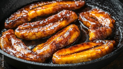 A close up of rich, glossy caramelized bananas in a cast-iron skillet, bubbling with golden-brown syrup, isolated on a dark rustic background