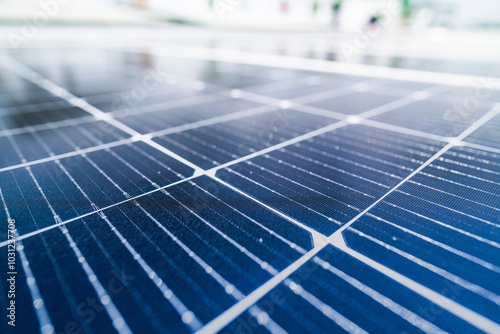 A close up of solar panels with a worker blurred in the background. The focus on the panels emphasizes the importance of renewable energy technology and solar power installations.