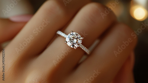 A close up of sparkling diamond engagement ring on hand, showcasing elegance and beauty. hand appears relaxed and ring shines brightly, evoking feelings of love and commitment.
