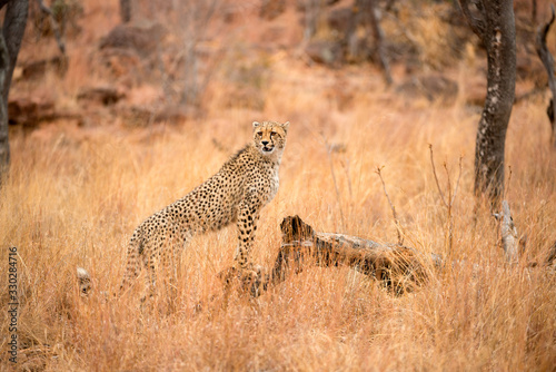 A close up photograph of a young, cheetah, standing on a dead tree stump, taken in the Welgevonden Game Reserve in South Africa.