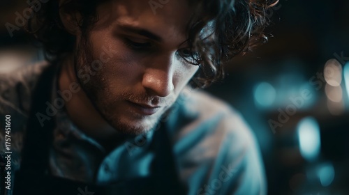 A close up portrait of a young man with curly hair wearing an apron looking down with intense focus bathed in moody cinematic lighting
