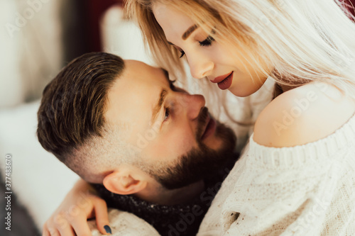 A close up portrait of two lovers. Bearded man looking at his woman. Caring man showing love to attractive his woman, enjoying tender moment.