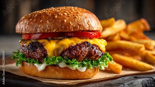 A close up shot of a cheeseburger with tomato and lettuce next to a pile of french fries