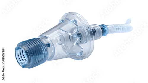 A close up shot of a clear plastic medical device with tubing on a black background studio shot