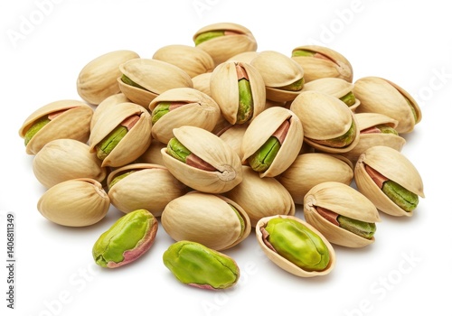 A close up shot of a pile of pistachios against a white background in a studio setting showing detail