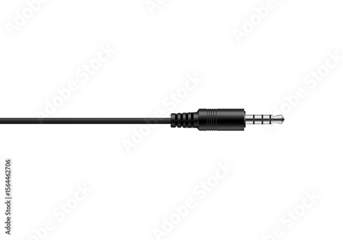 A close up view of a black audio cable with a four pole connector on a white background surface