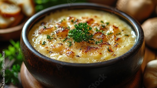A close up view of a bowl of cheesy dip with parsley garnish on a wooden surface