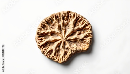 A close up view of a brown, coral like sea anemone with an intricate texture, resting on a white surface.