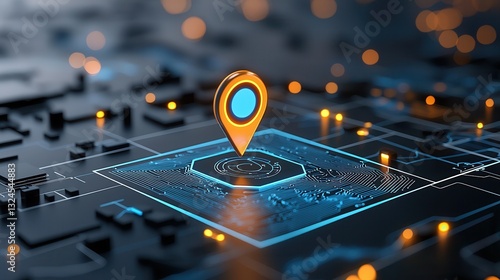 A close up view of a futuristic and advanced navigation marker or pin displayed on a soft blurred digital surface