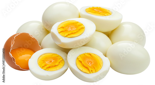 A close up view of a pile of hard boiled eggs with one cracked open and showing the yolk inside it