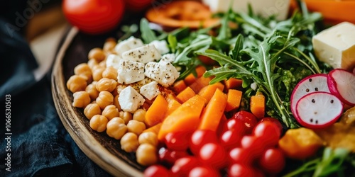 A close up view of a traditional lunch presentation features a salad with carrots, radishes, chickpeas, feta cheese, arugula, and tomatoes, accompanied by fresh butter.