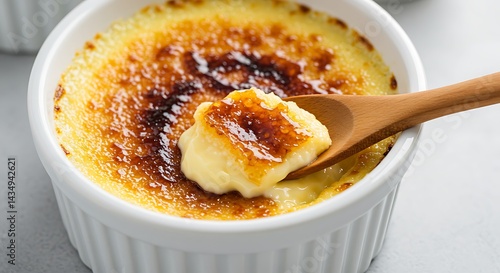 A close up view of crème brûlée in a white ramekin with a wooden spoon taking a bite of the dessert