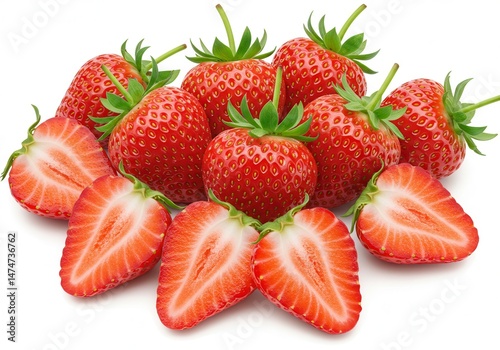 A close up view of several fresh strawberries with some cut in half on a white surface area