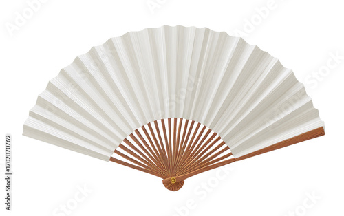 A closed, white paper fan with a light brown wooden handle