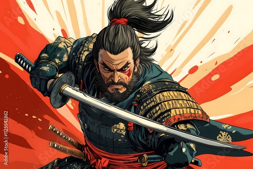 A close-up digital cartoon-like illustration of a powerful samurai wearing armor and wieldign a sword