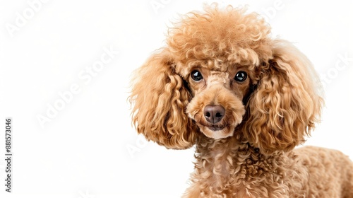 A close-up headshot of a Poodle on a white background, showcasing its expressive eyes, dog, fluffy fur, friendly, cute, mans best friend