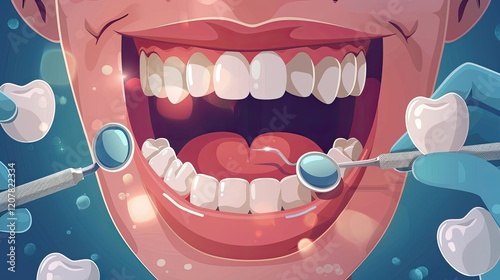 A close-up illustration of an open mouth with dental tools, emphasizing oral health and hygiene.
