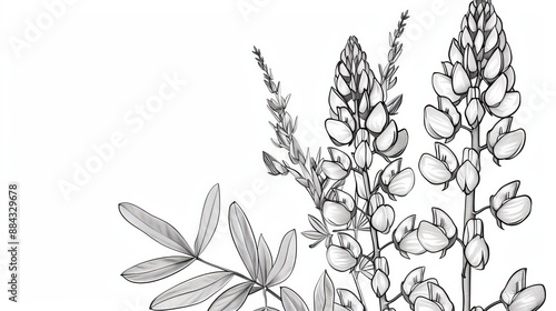 A close-up illustration of lupine flowers, highlighting the intricate details of its petals and leaves, drawing attention to the beauty of botanical art in monochrome style.