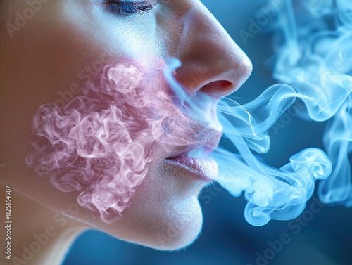 A close-up image capturing a person exhaling softly billowing, ethereal smoke, highlighting textures, colors, and the mysterious interaction between light and vapor