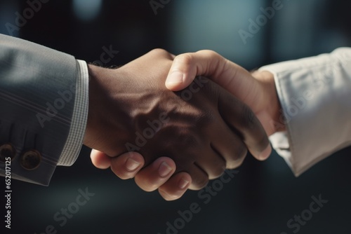 A close-up image capturing two people shaking hands. This picture can be used to symbolize a business deal, partnership, agreement, or teamwork.