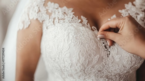 A close-up image of a hand adjusting the bodice of a lace wedding dress, showcasing the detailed craftsmanship and delicate nature of the bridal garment in preparation.