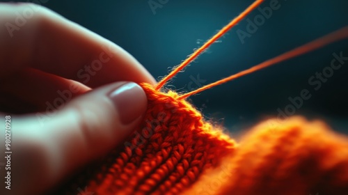 A close-up image of a hand knitting with vibrant orange yarn, showcasing craft and creativity in a cozy atmosphere.