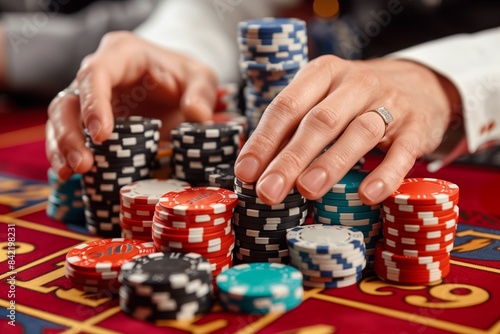A close-up image of a hand placing a stack of colorful casino chips on a red felt table, representing the excitement of online gambling and betting