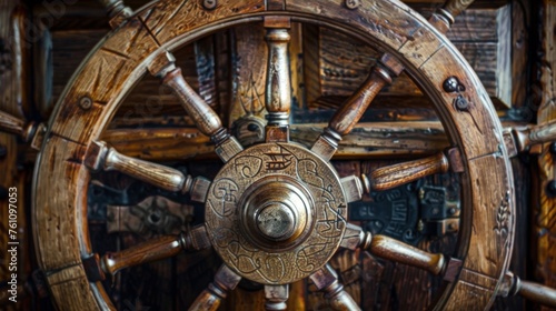 A closeup image of a large wooden ships helm shows intricately carved designs and symbols. The wheel is encompassed by worn leather indicating years of use and experience.