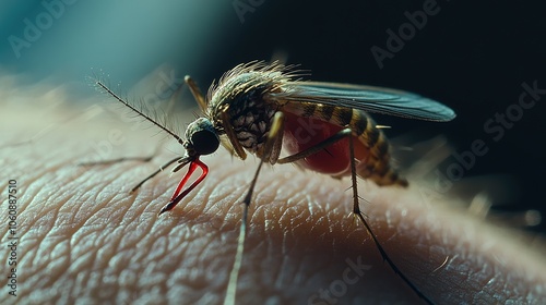 A close-up image of a mosquito feeding on a man's arm, showcasing the tiny details of the insect's body and wings, with blood visible in the proboscis, emphasizing the moment of feeding
