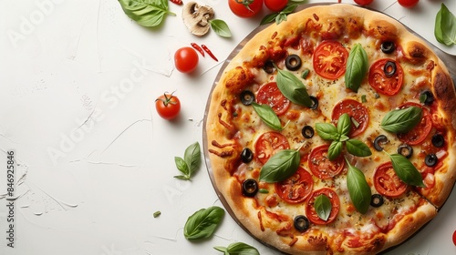 A close-up image of a pizza with tomatoes, basil, and black olives