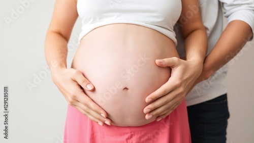 A close-up image of a pregnant woman, gently holding her baby bump with both hands. The couple's hands are lovingly placed around her belly, highlighting the joy and intimacy of the pregnancy.