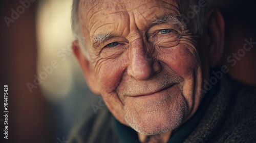 A close-up image of a smiling elderly man with a warm, gentle expression, capturing the serenity and contentment of life in a sunny outdoor environment.
