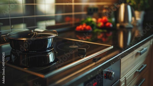 A close-up image of a stove top with a pot placed on it, ready for cooking