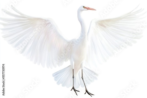 A close-up image of a white bird with its wings spread out, ready for takeoff