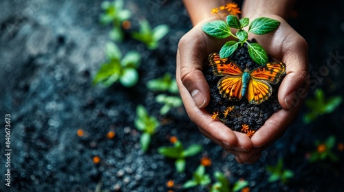 A close-up image of hands cupped together, gently holding a small plant and a butterfly perched on top of the soil. The hands are surrounded by greenery and small flowers